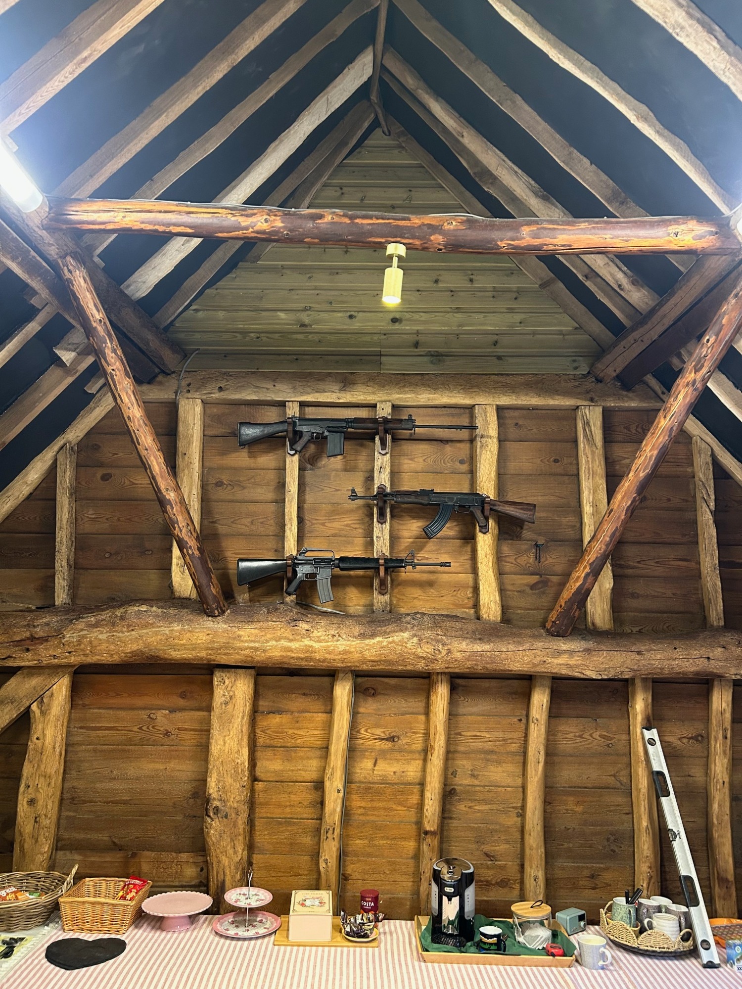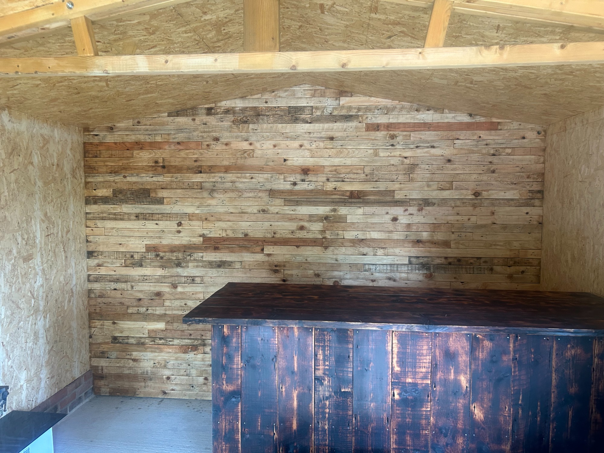 This summerhouse was converted to a bar. Insulated and lined walls with reclaimed wood used for feature walls and the bar.