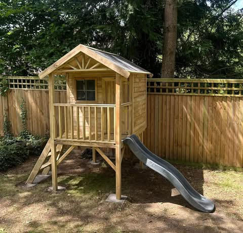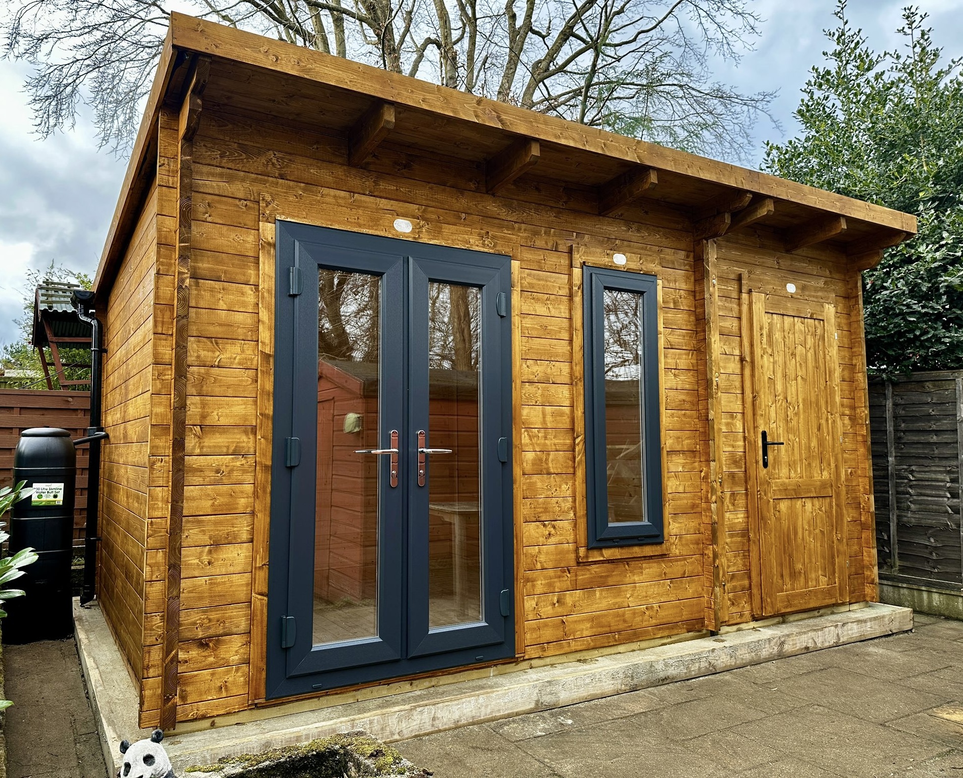 Summerhouse installed with UPVC double glazing, gutters and water butts. Finished with a protective stain.