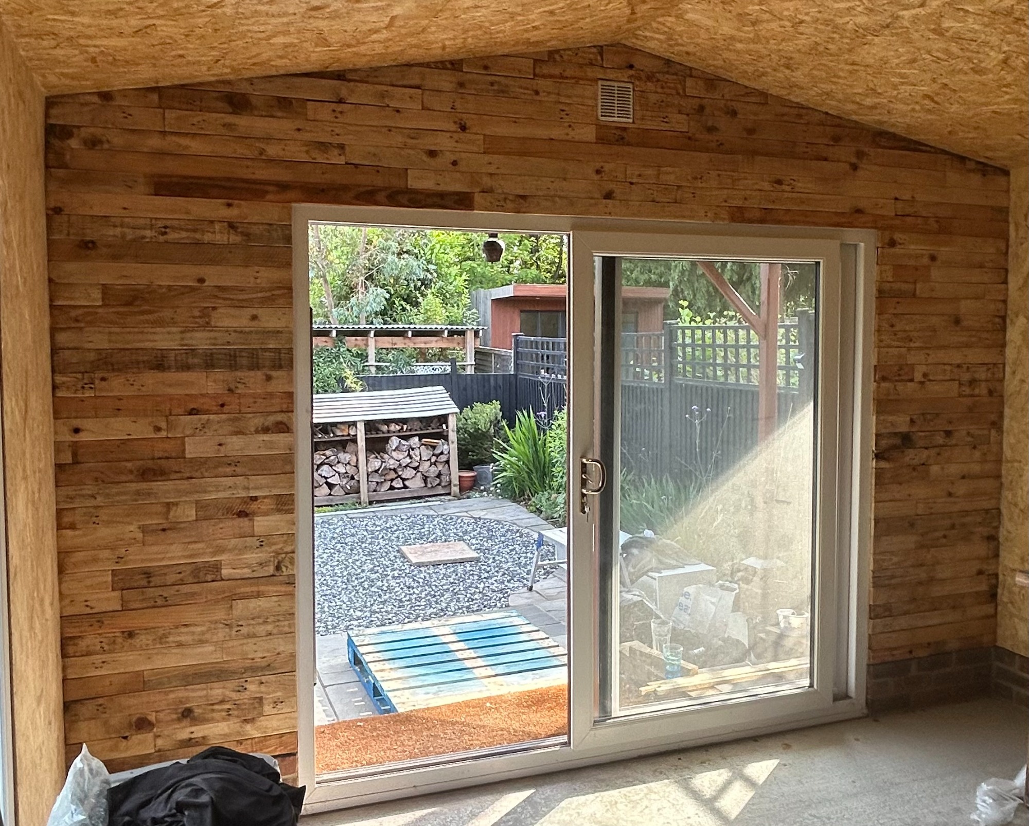 This summerhouse was converted to a workshop. Insulated and cladded walls whilst the floor was reinforced with ply for a future flooring.